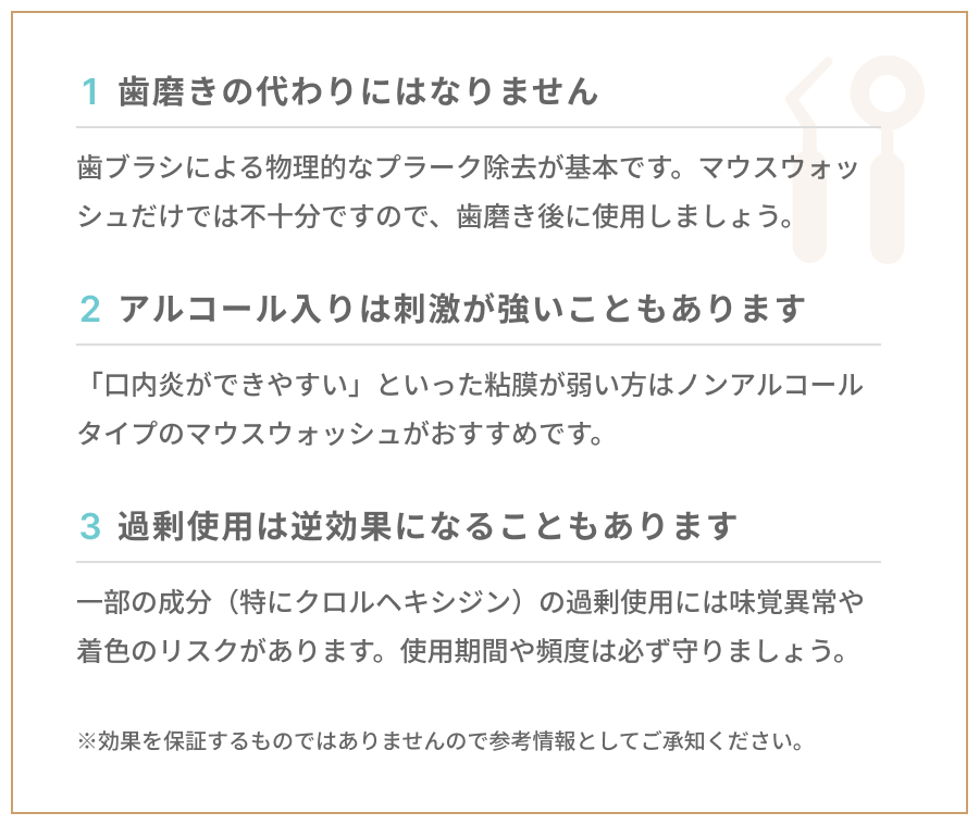 一部の成分(特にクロルヘキシジン)の過剰使用には味覚異常や着色のリスクがあります。使用期間や頻度は必ず守りましょう。