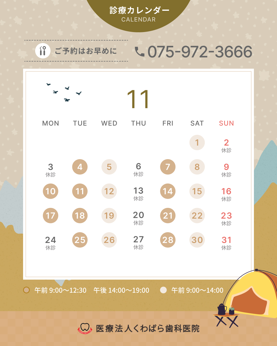 2025年10月31日 お知らせ 11月の診療日のお知らせ こんにちは。くわばら歯科医院です。 肌寒い日が増えてきましたね。 来月11月の診療日をご案内いたします。 ご予約はWebサイト・お電話でお願いいたします。 10月の診療日のお知らせ 一覧へ戻る
