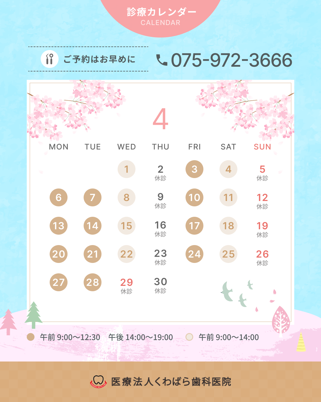 2026年03月24日 お知らせ 4月の診療日のお知らせ こんにちは。くわばら歯科医院です。 来月4月の診療日をご案内いたします。 ご予約はWebサイト・お電話でお願いいたします。 3月の診療日のお知らせ 一覧へ戻る