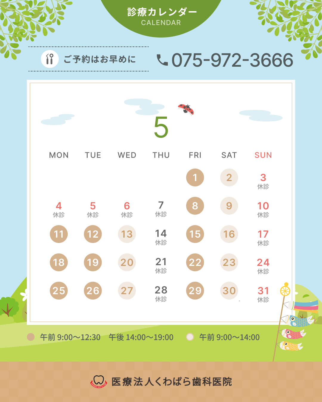 2026年04月24日 お知らせ 5月の診療日のお知らせ こんにちは。くわばら歯科医院です。 来月5月の診療日をご案内いたします。 ご予約はWebサイト・お電話でお願いいたします。 4月の診療日のお知らせ 一覧へ戻る